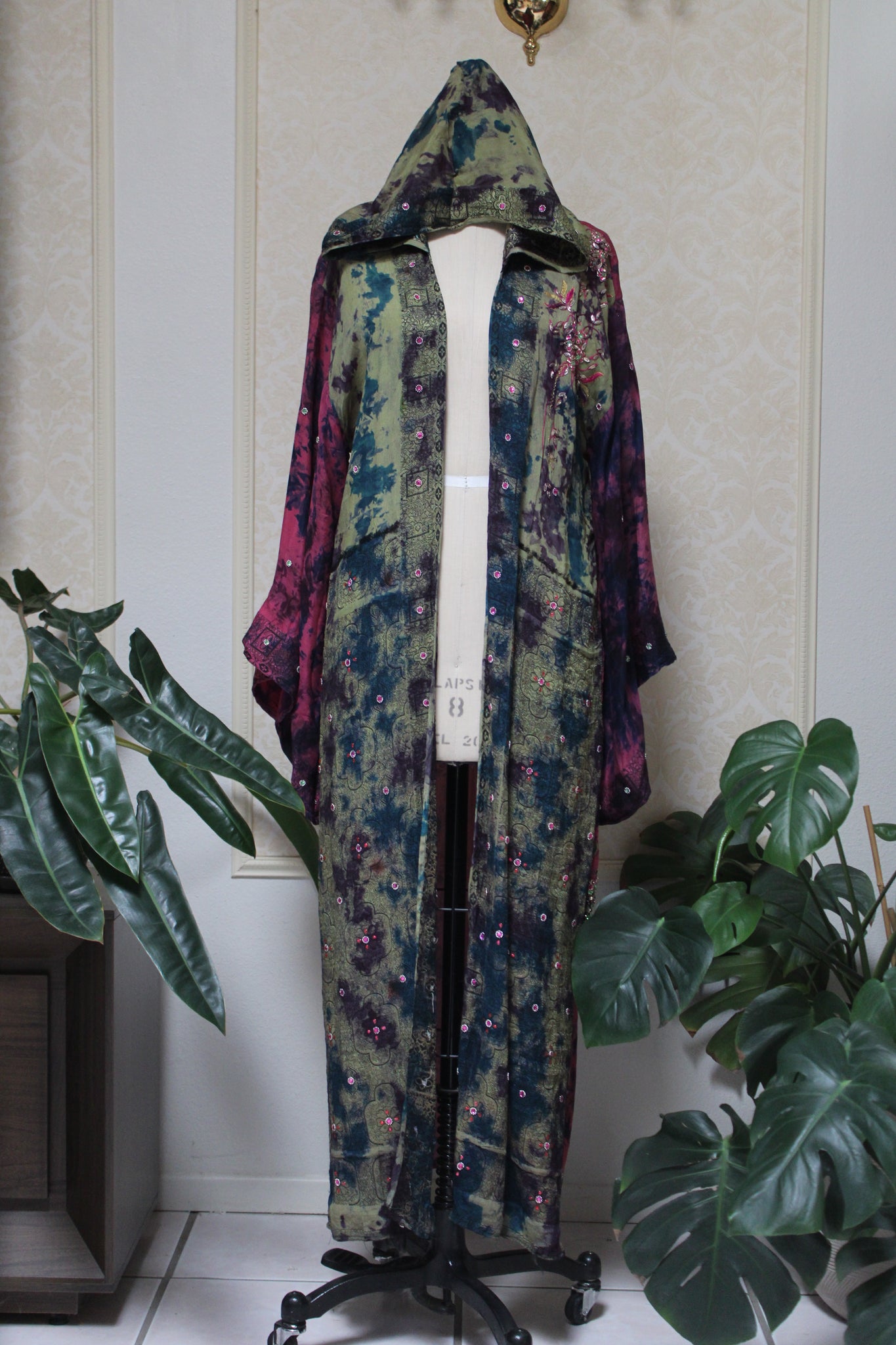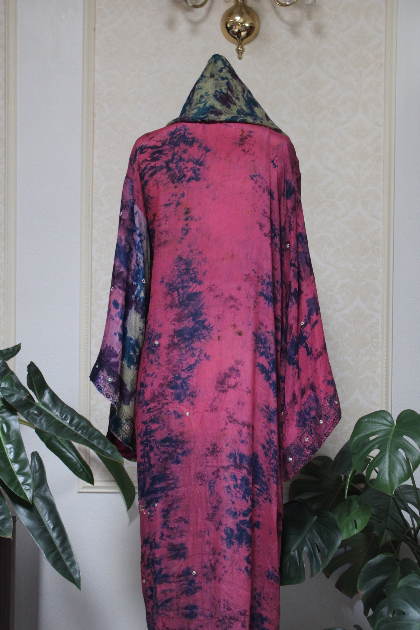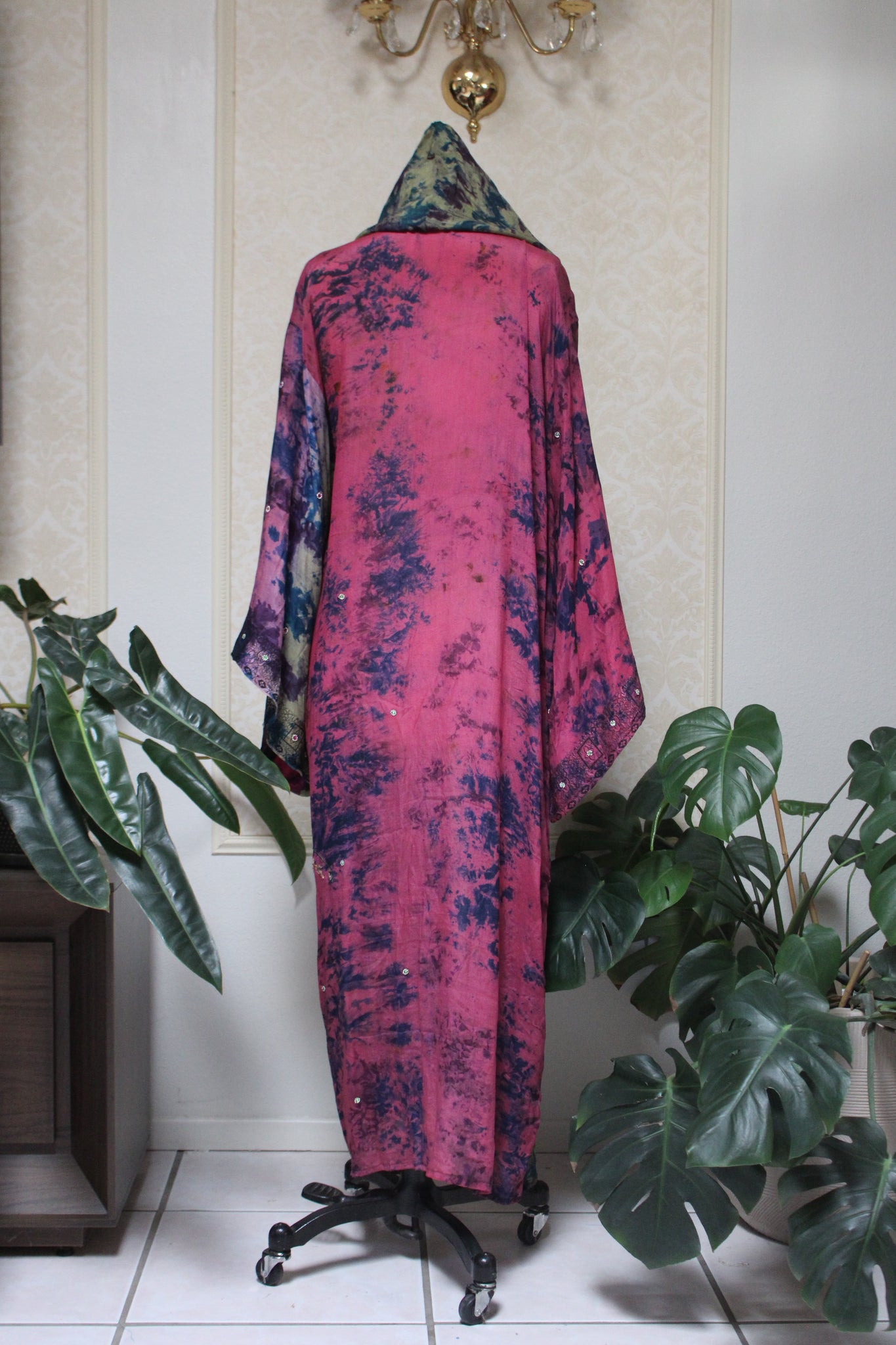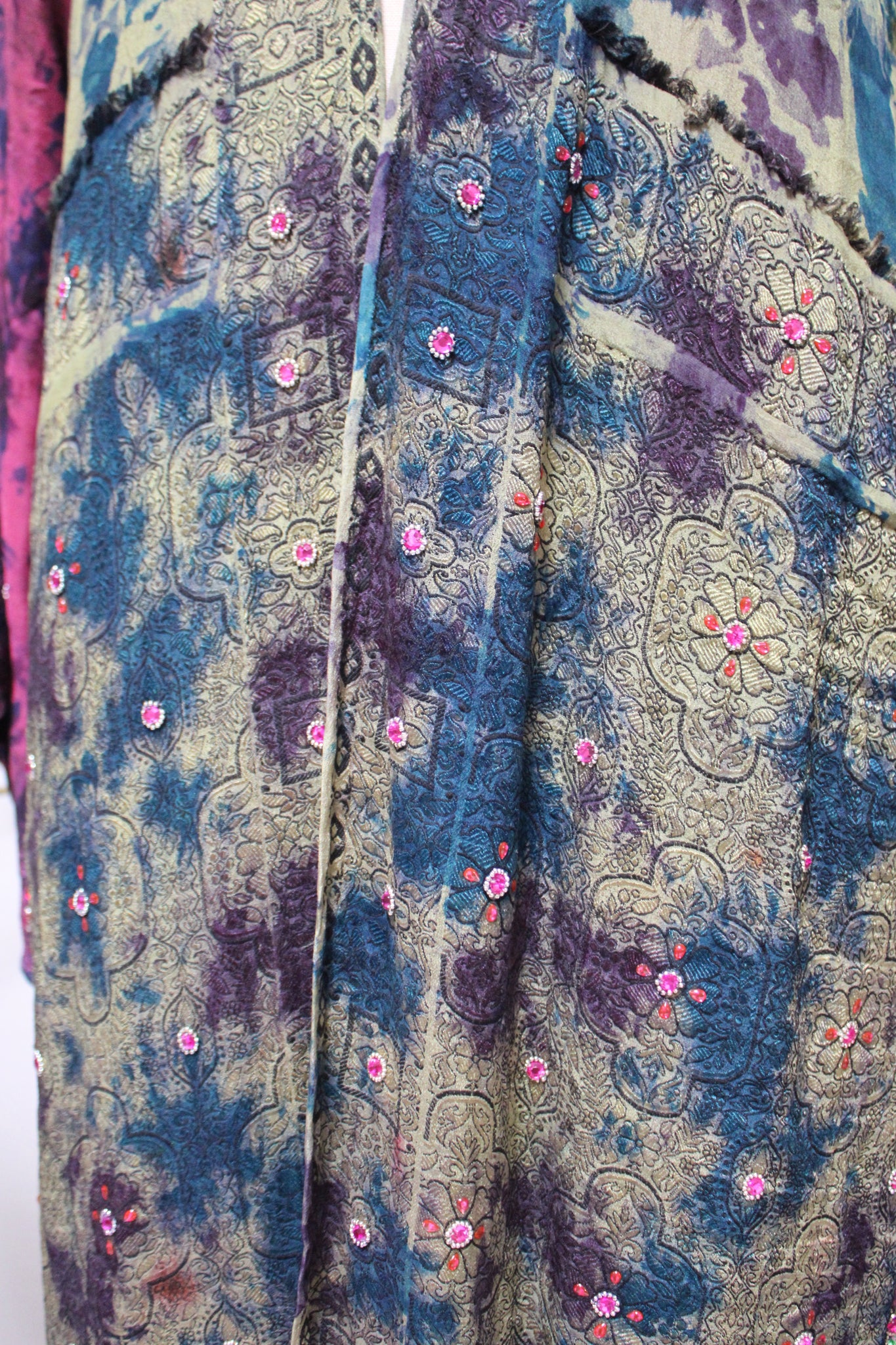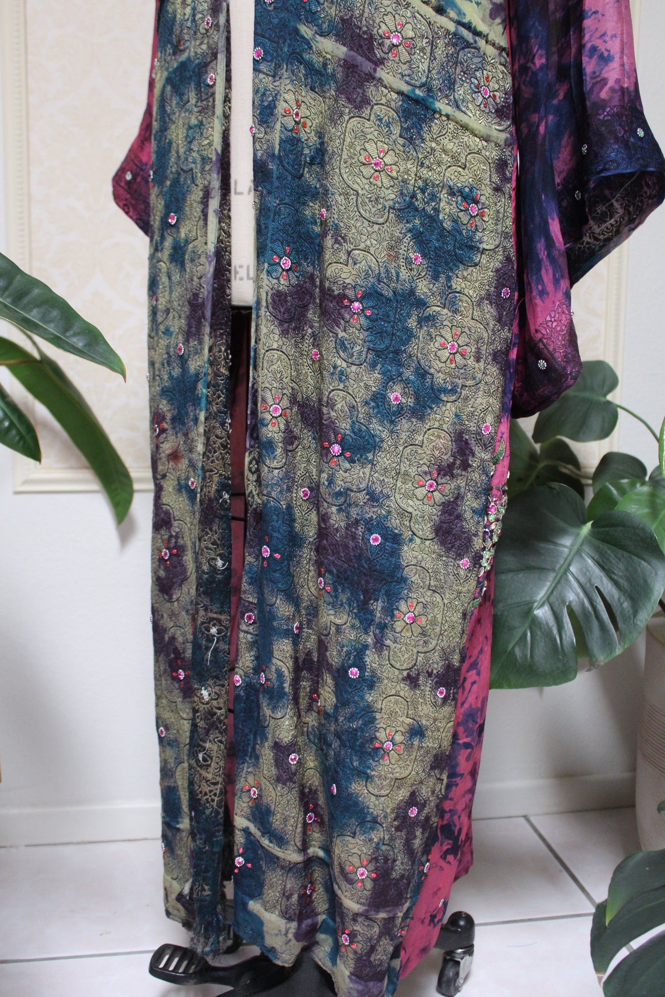 One of a kind Kimono is hand embroidered, hand dyed, and designed from vintage Indian saree.